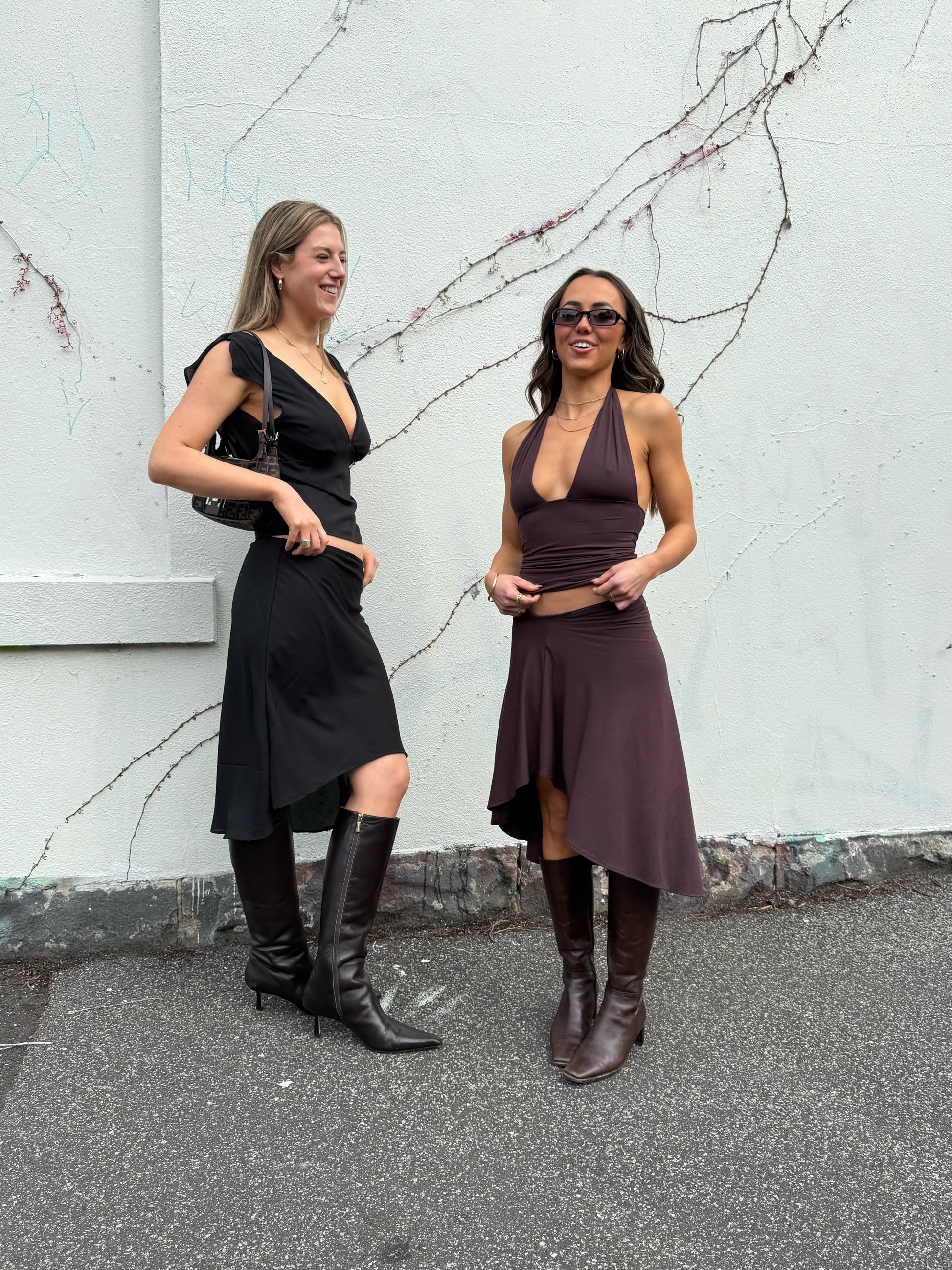 The Amelia Skirt, is a perfect blend of elegance and movement. Designed to sit low-waisted, with a deep V waistline, the skirt drapes beautifully creating a flattering and feminine silhouette. The asymmetrical hemline adds movement and flow, making it perfect for casual and elevated styling. Complete the look with the Cocoa Halter Amelia Top.