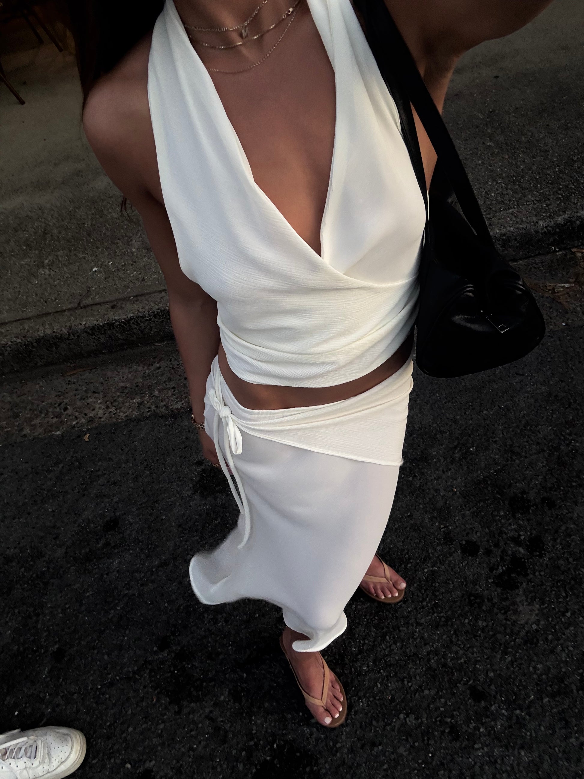 A soft, airy midi crafted in delicate cream chiffon. Designed for fluidity, the Rae includes a detachable tie that can be worn for extra coverage or removed for a sheer, lightweight finish. Wear it on its own, styled over pants, or layered however you love. The Rae Midi is a versatile MG piece with an ethereal feel.